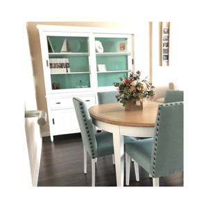 Así ha quedado el salón de nuestros clientes, alegre, luminoso y natural, gracias a la combinación de blancos con roble en la mesa de comedor espectacular, que además es extensible +100cm y el punto de color aguamarina que le dan las sillas con tachuelas y la trasera ranurada de la vitrina.
